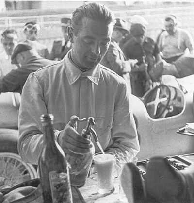 Pit conditions were a trifle laxer than in the Land of the Free, as the camerca catches Bernd restoring the tissues with a relaxed snort, while Der Schnurrbiber, sans shirt, in the background oversees the tirefitting for the next run. A young German’s dream of paradise.