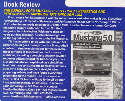 If it has anything to do with our beloved 5.0 Kirschenbaum goes through it with a fine-toothed comb with simple explanations for the even the most complex of technicalities. Performance additions, including a complete chapter devoted to power adders (except for turbochargers), are also delved into and explained on a simplified level. We have consulted the book several times already to help get our facts straight when preparing articles and have found everything to be right on the money. The price may be steep at $34.95, but it will pay for itself through increased mechanical knowledge. To increase your knowledge of 5.0 Mustangs, contact Bentley Publishers.