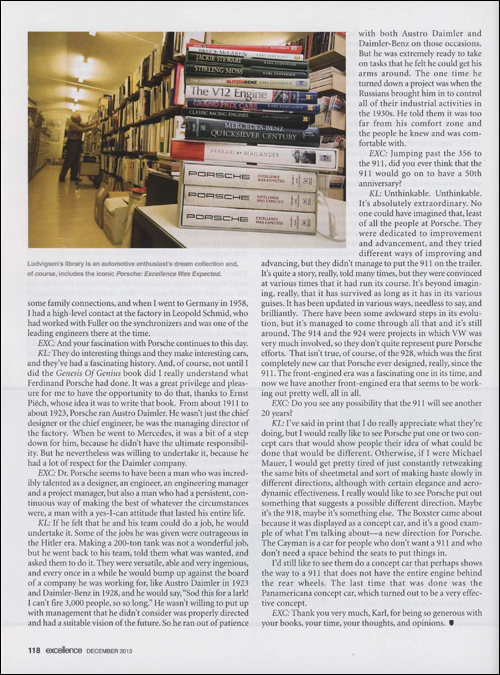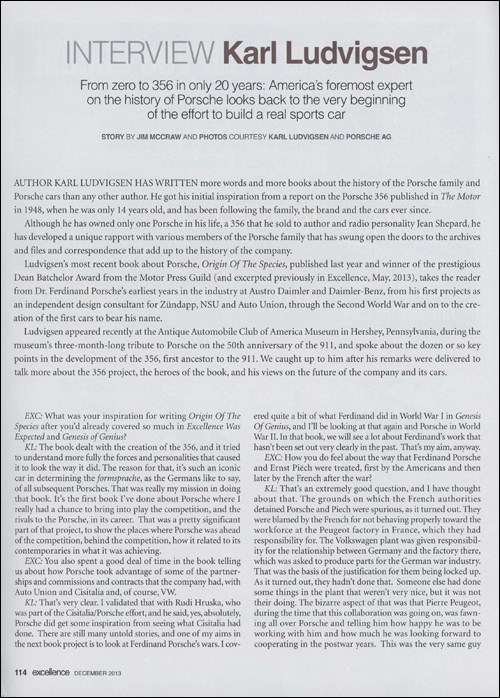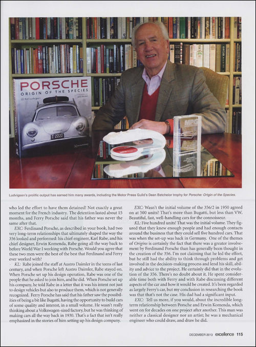 Ludvigsen's most recent book about Porsche, Origin Of The Species, published last year and winner of the prestigious Dean Batchelor Award from the Motor Press Guild (and excerpted previously in Excellence, May, 2013), takes the reader from Dr. Ferdinand Porsche's earliest years in the industry at Austro Daimler and Daimler-Benz, from his first projects as an independent design consultant for Zündapp, NSU and Auto Union, through the Second World War and on to the creation of the first cars to bear his name.
